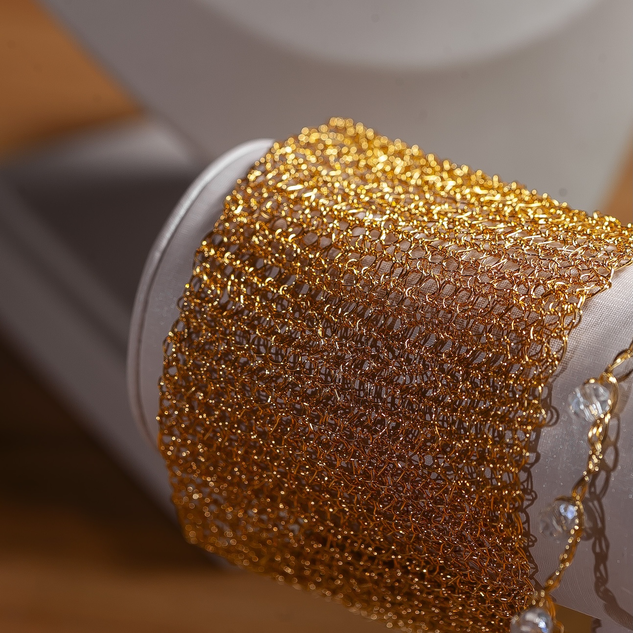 Bracelete largo em fio tramado, banhado a ouro 18k.