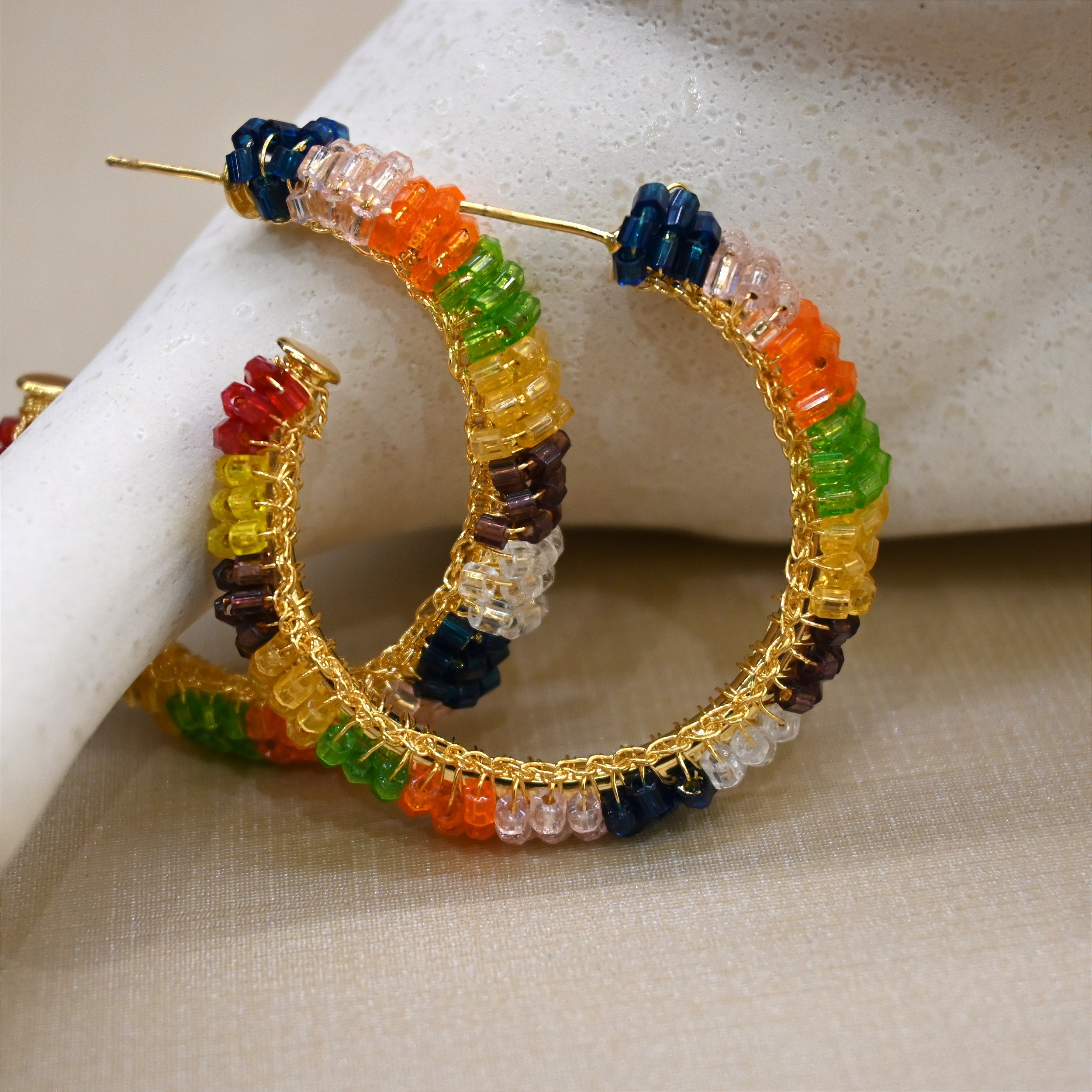 Argola em fio banhado a ouro 18k, e vidrilhos coloridos.