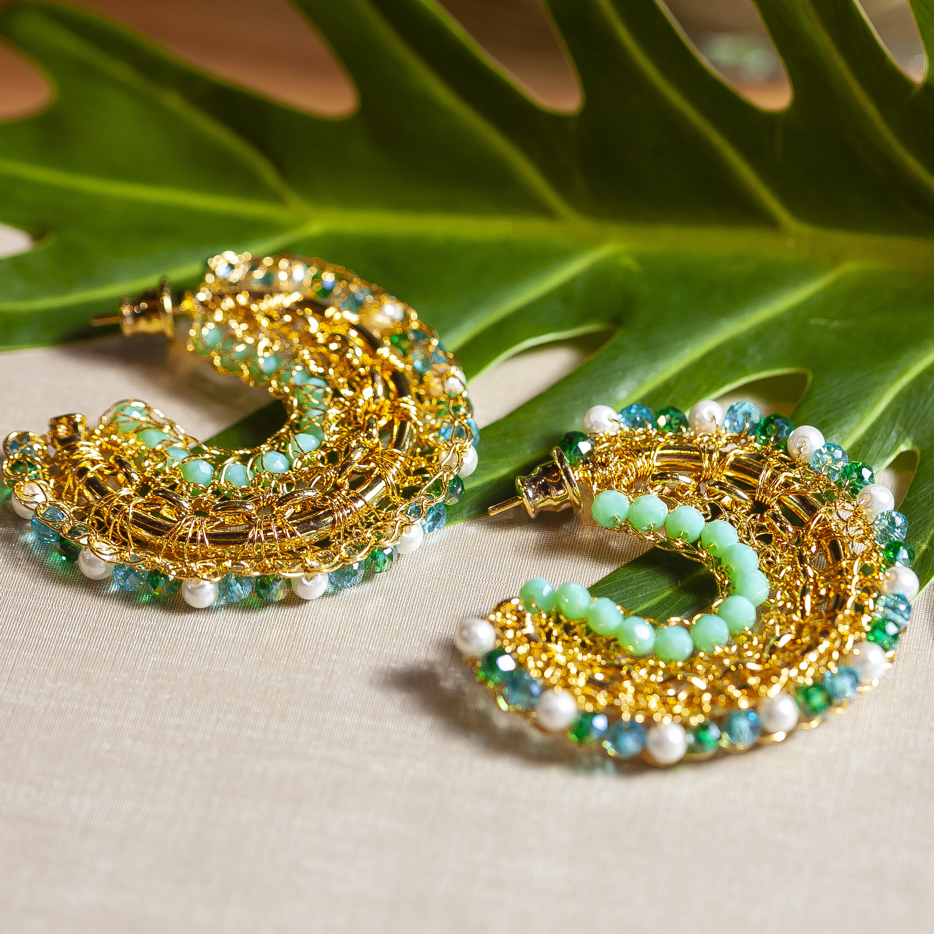 Brinco formato argola, com crochê tramado em ouro 18 quilates. Pedras em variação de verde e pérola.