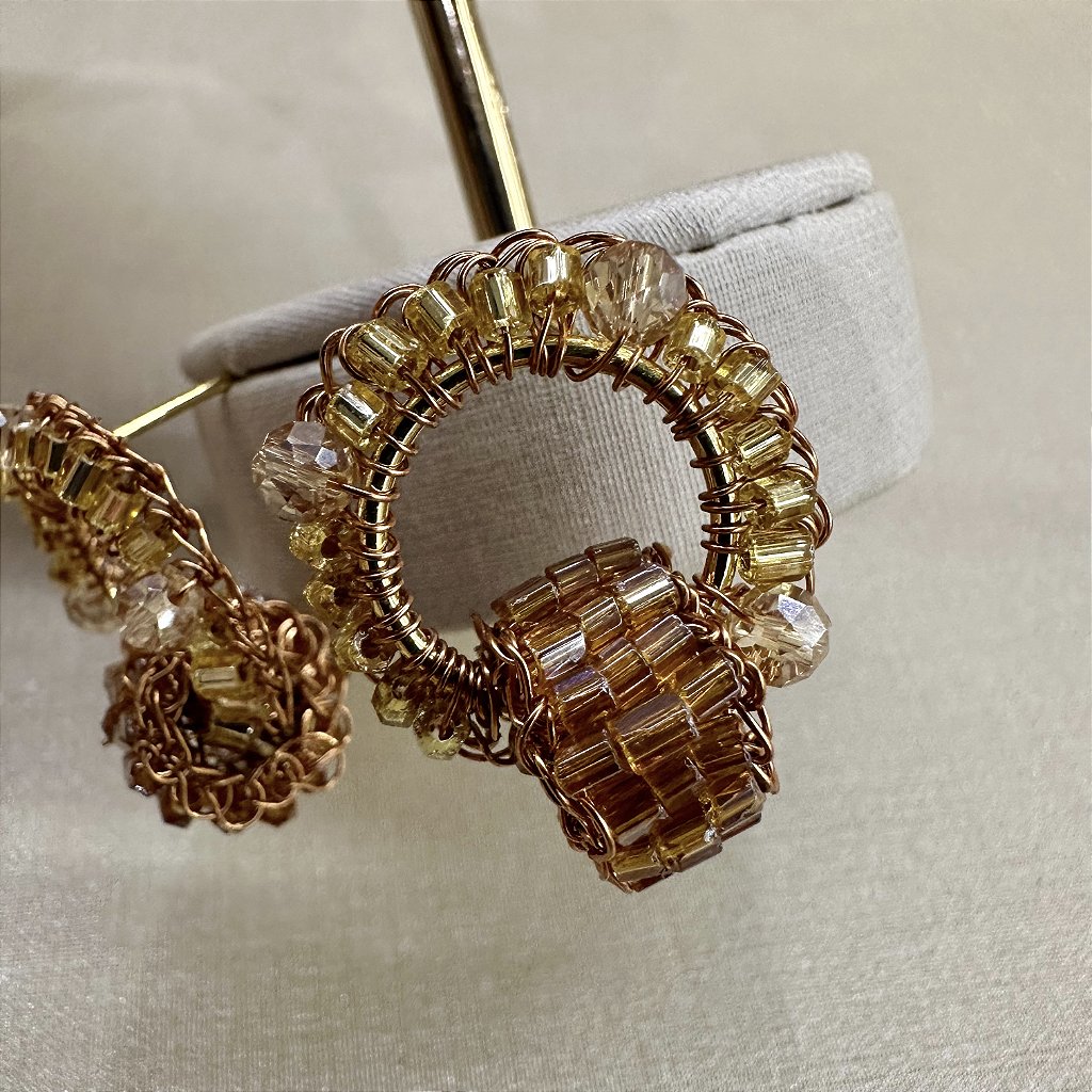 Peças cuidadosamente produzidas em fios de cobre com banho antialérgico em ouro 18k ou paládio. A peça tem seu brilho próprio com cristais, vidrilhos e pedras naturais.
