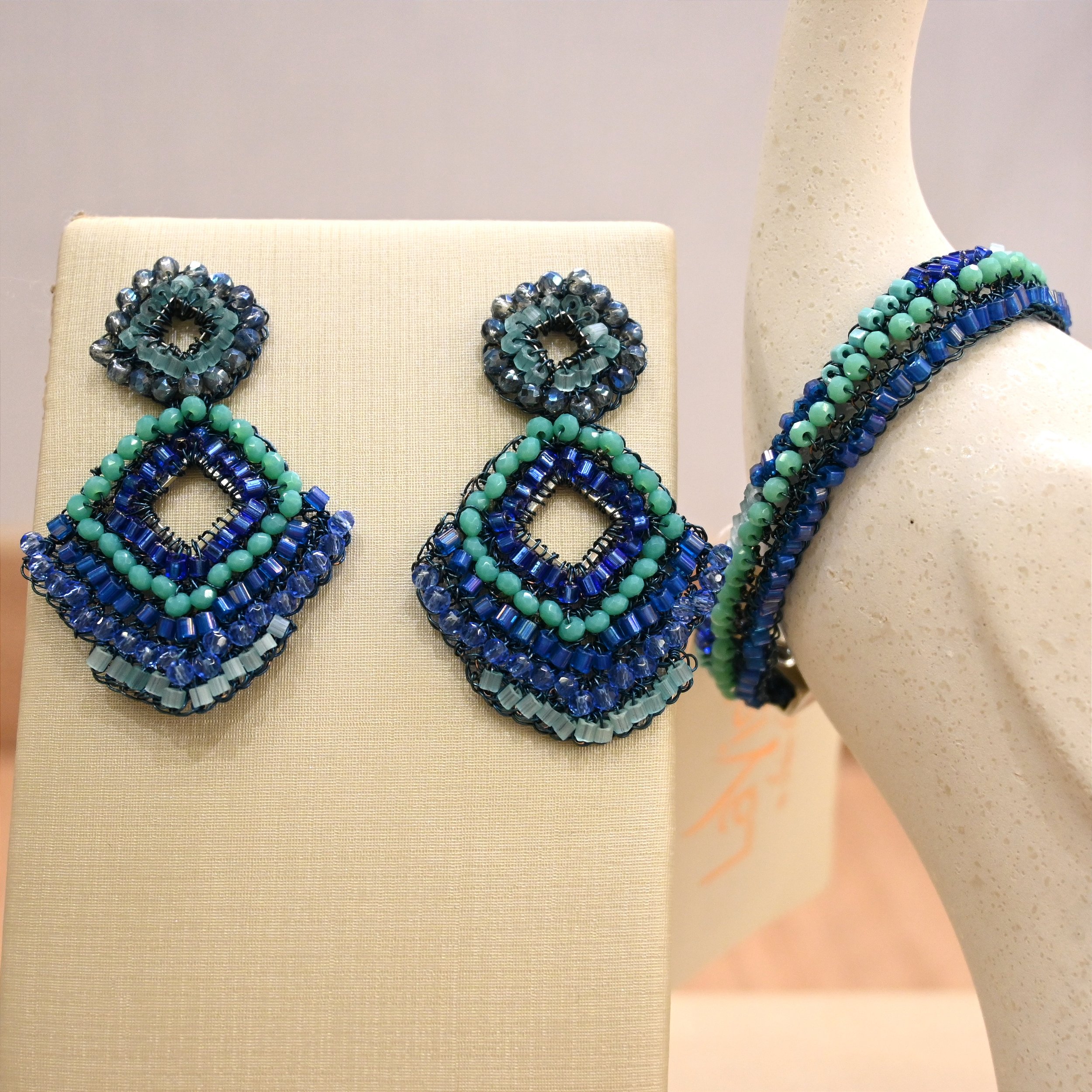 Bracelete em fio azul, com cristais e vidrilhos variando em tons de azul.