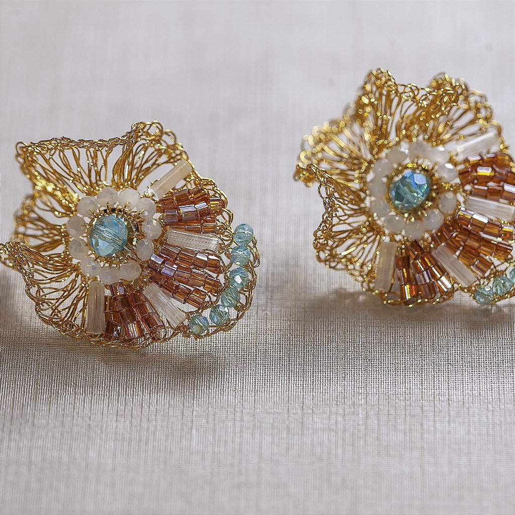 Brinco em banho 18k, cristais e vidrilhos variando de marrom claroa a zul.