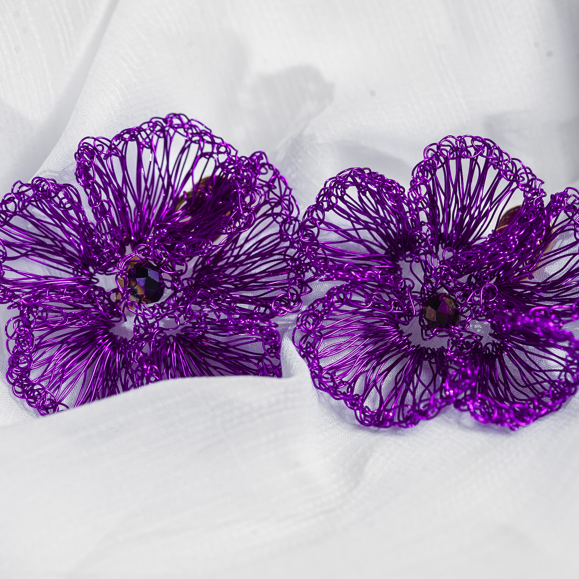 Peças cuidadosamente produzidas em fios de cobre com banho antialérgico em ouro 18k ou paládio. A peça tem seu brilho próprio com cristais, vidrilhos e pedras naturais.