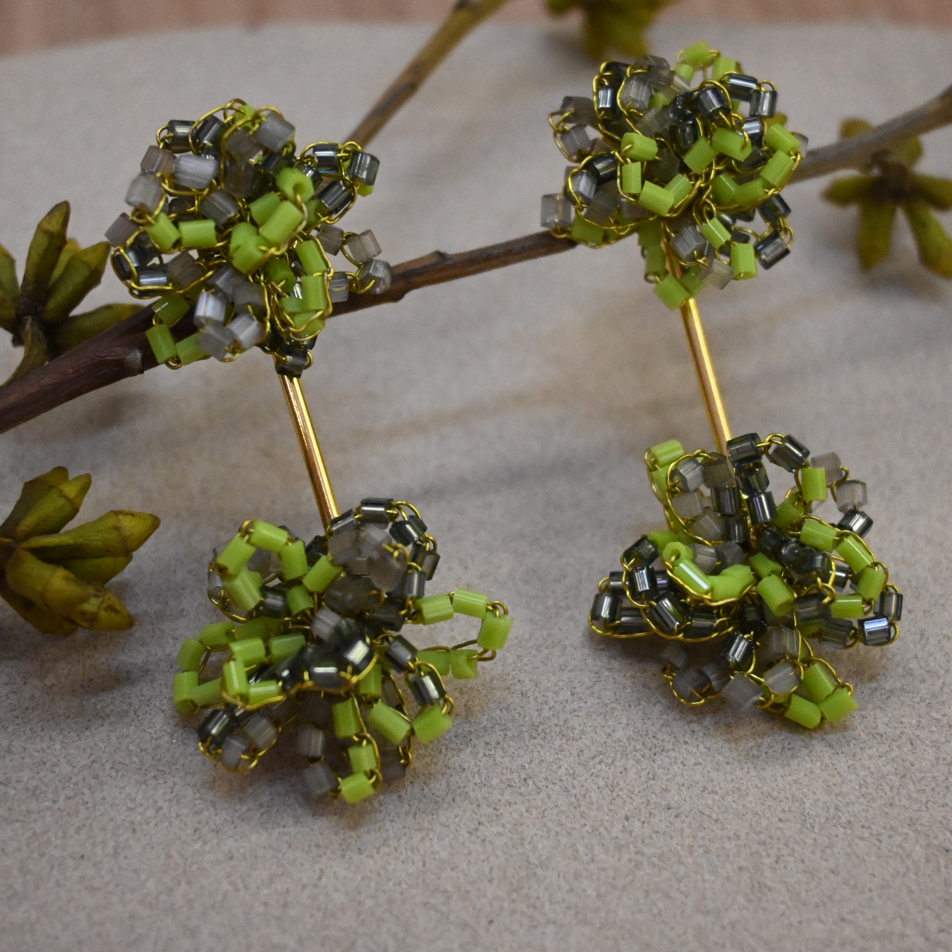 Brinco frufru 2 em 1. Podendo usar apenas o frufru de cima, como colocar o pêndulo. Fio pistache com pedrinhas variando em tons de verde.