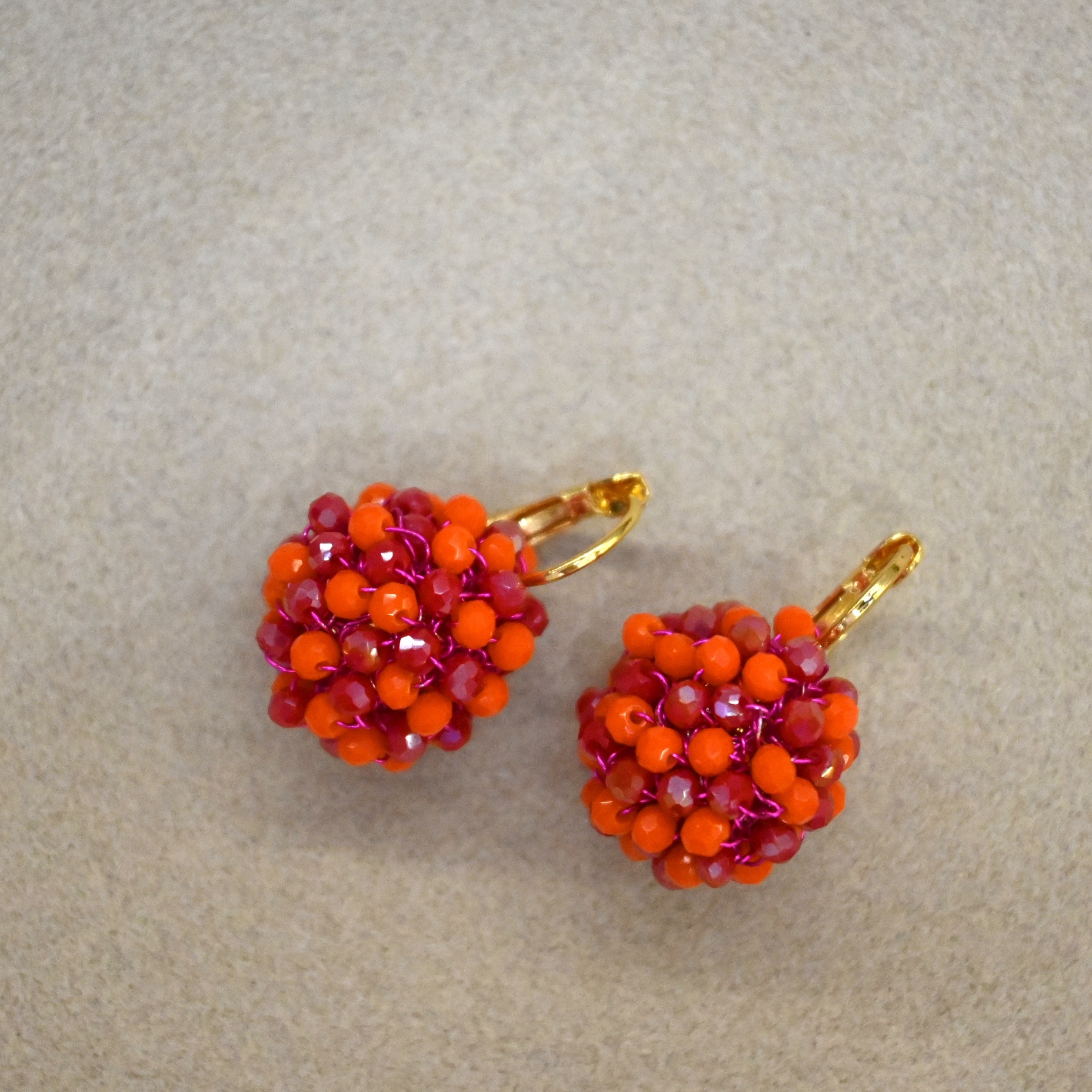 Brinco em fio resinado pink, com pedras em oink furta cor e alaranjado.