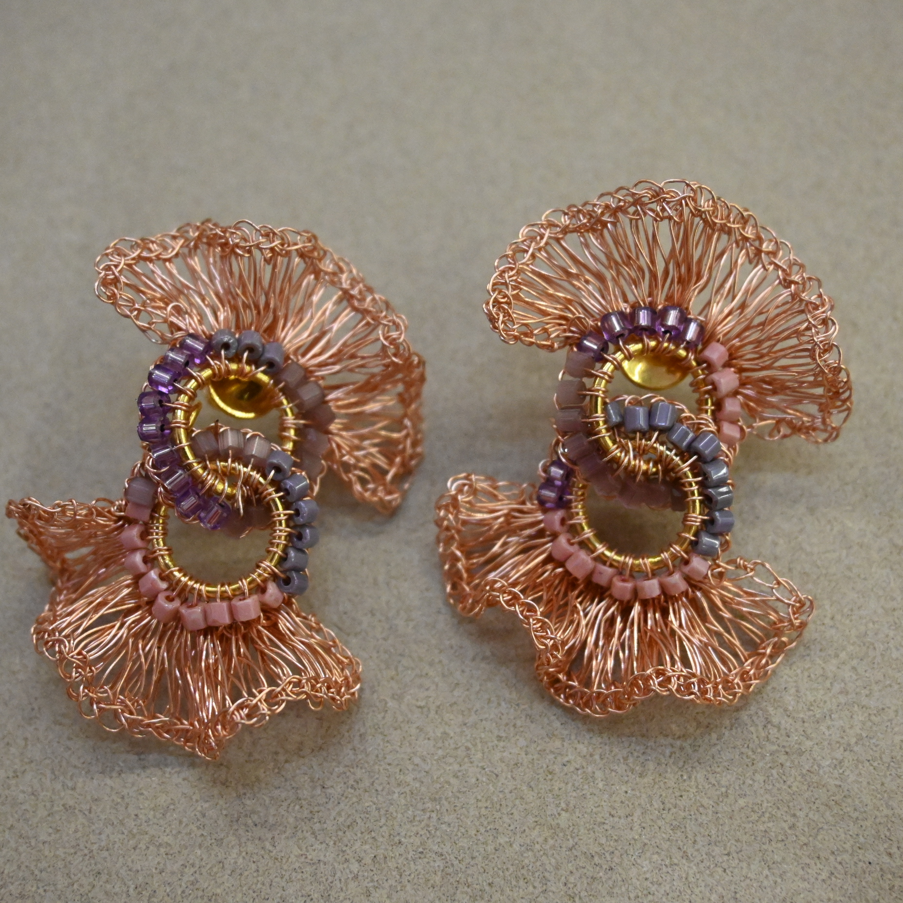 Brinco em fio rosê com pedras variando em tom de lavanda e rosa.