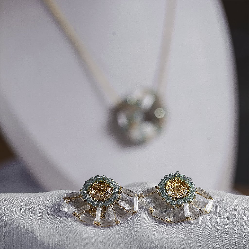 Peças cuidadosamente produzidas em fios de cobre com banho antialérgico em ouro 18k ou paládio. A peça tem seu brilho próprio com cristais, vidrilhos e pedras naturais.