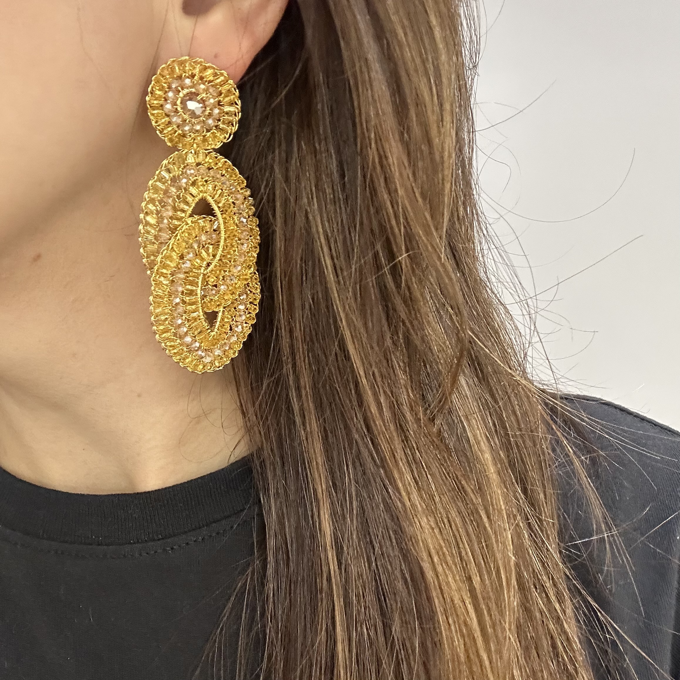 Peças cuidadosamente produzidas em fios de cobre com banho antialérgico em ouro 18k ou paládio. A peça tem seu brilho próprio com cristais, vidrilhos e pedras naturais.