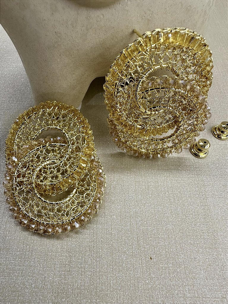 Peças cuidadosamente produzidas em fios de cobre com banho antialérgico em ouro 18k ou paládio. A peça tem seu brilho próprio com cristais, vidrilhos e pedras naturais.