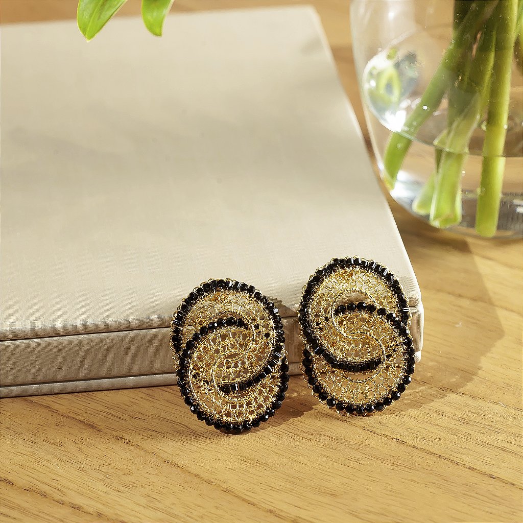 Brinco em fio banhado e cristais pretos.