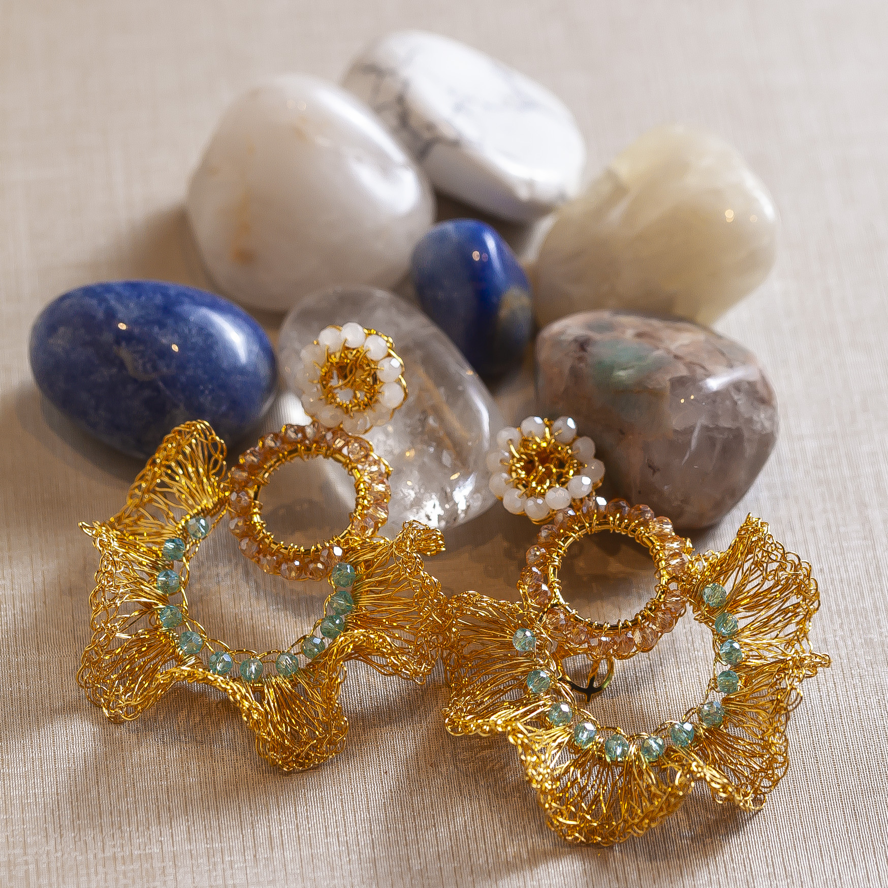 Peças cuidadosamente produzidas em fios de cobre com banho antialérgico em ouro 18k ou paládio. A peça tem seu brilho próprio com cristais, vidrilhos e pedras naturais.