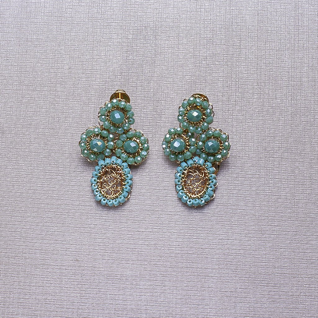 Brinco banhado a ouro 18 quilates , cristais e vidrilhos em tons de verde.