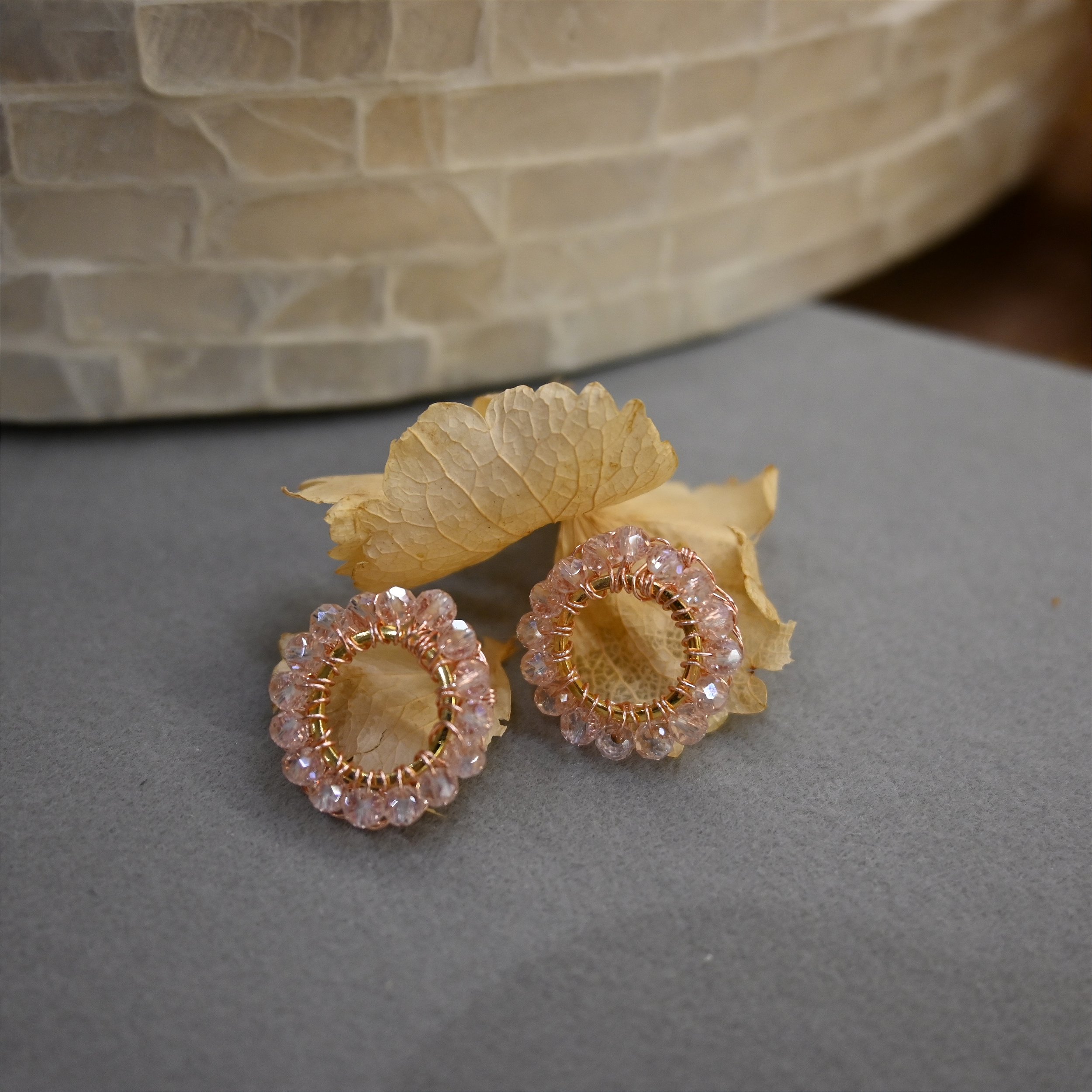 Peças cuidadosamente produzidas em fios de cobre com banho antialérgico em ouro 18k ou paládio. A peça tem seu brilho próprio com cristais, vidrilhos e pedras naturais.