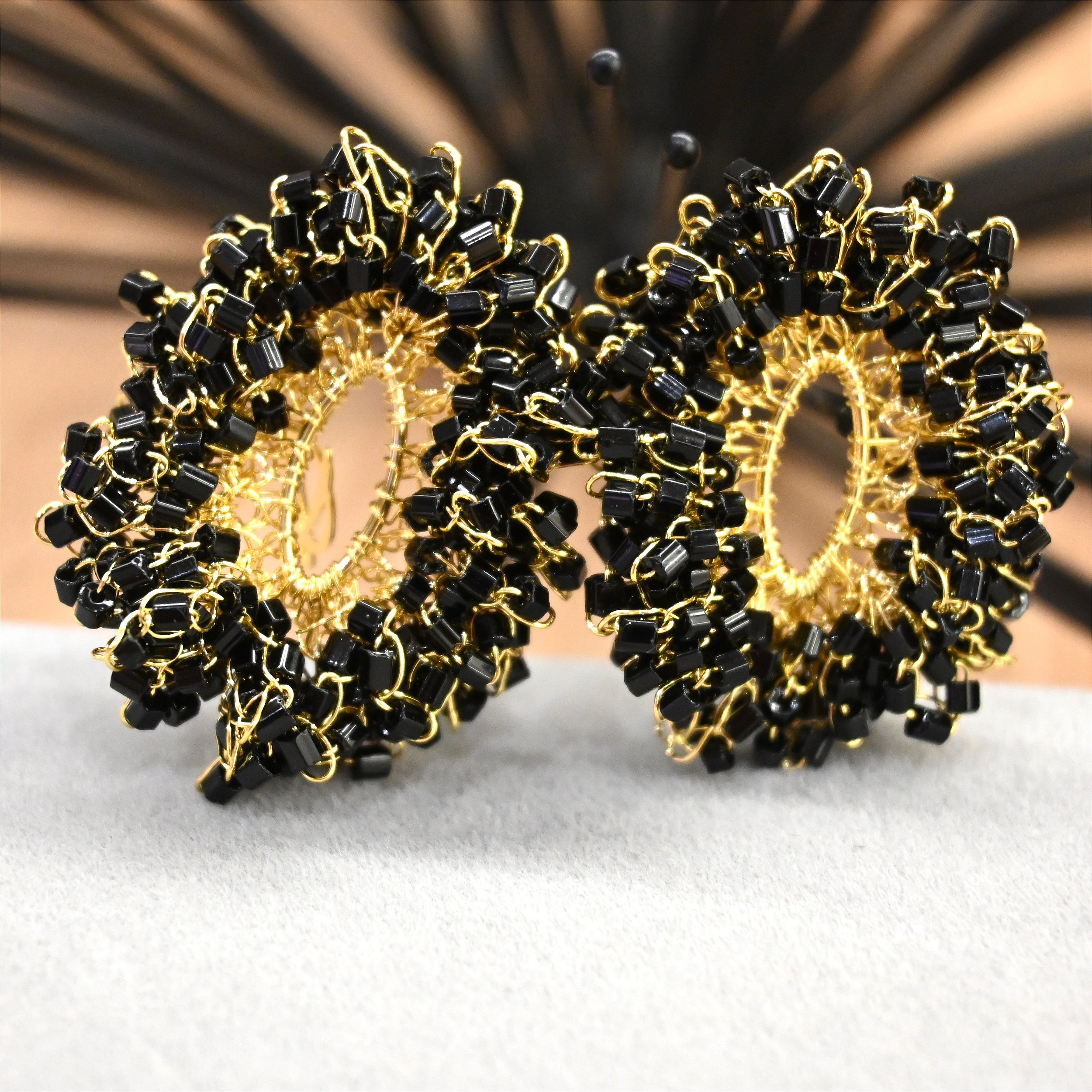 Brinco em fio banhado a ouro 18k, e vidrilhos pretos.
