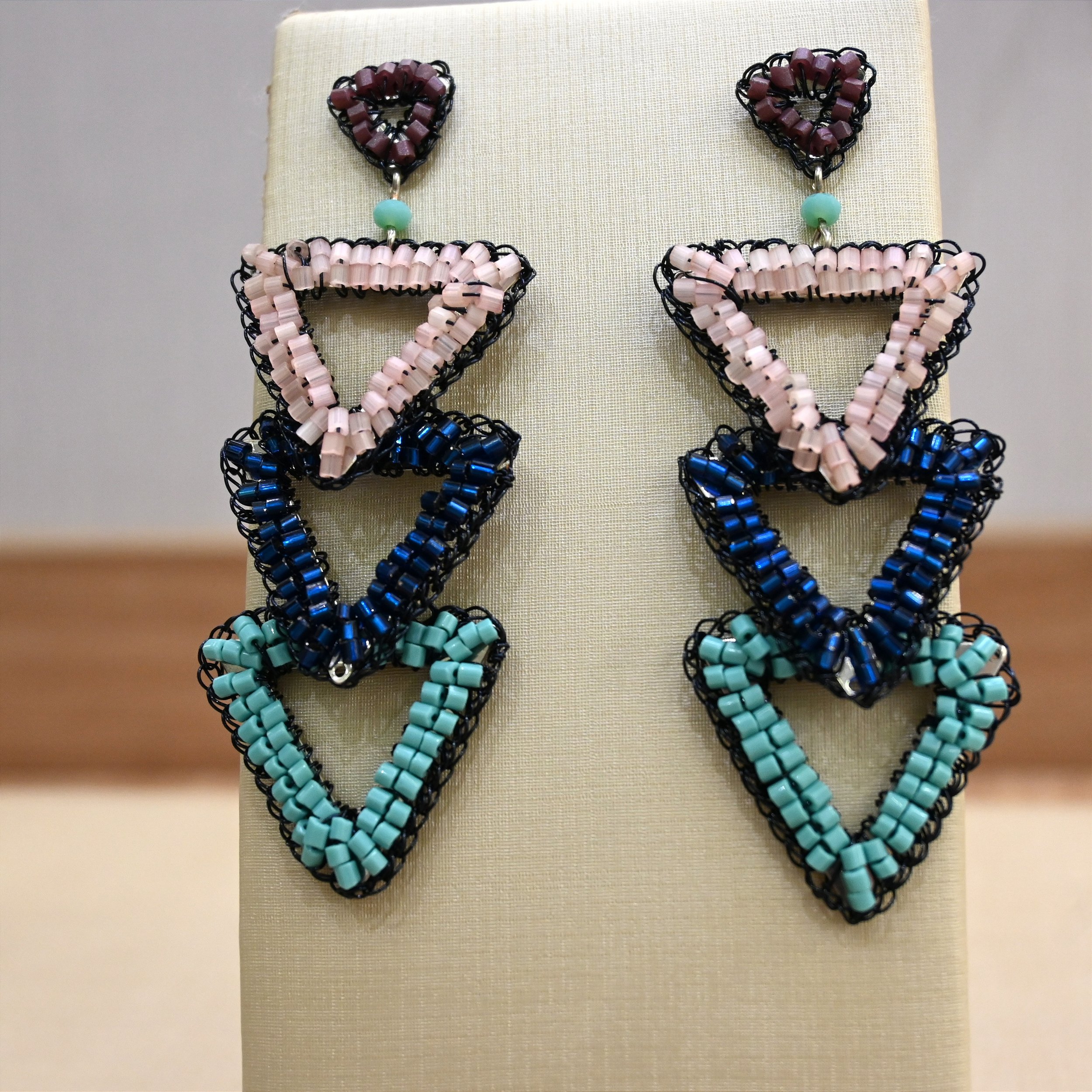 Brinco em fio preto, com vidrilhos em rosa e tons de azul.