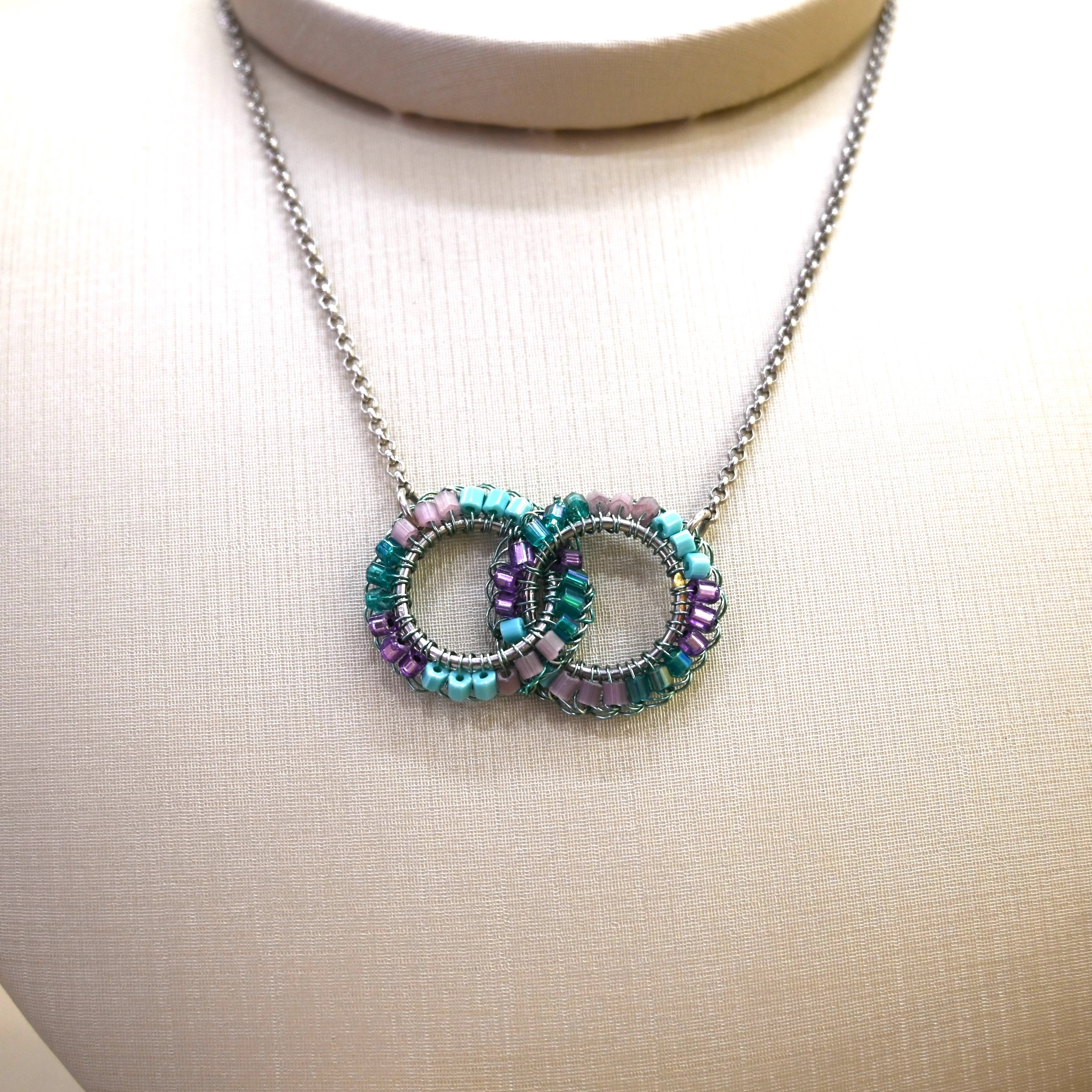 Colar banhado em paladio, com fio verde e vidrilhos em verde e lavanda.