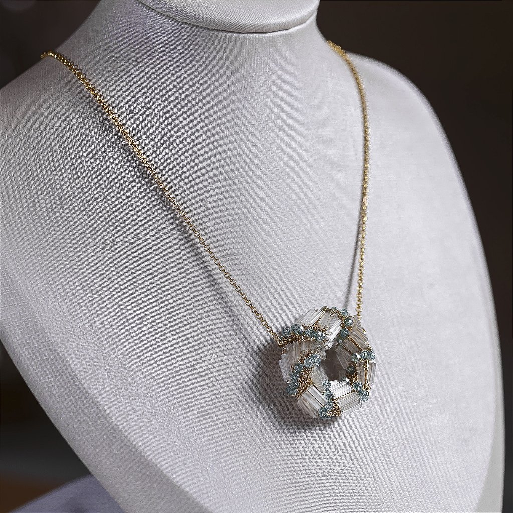 Colar com vidrilhos off e cristais em tom de azul claro.