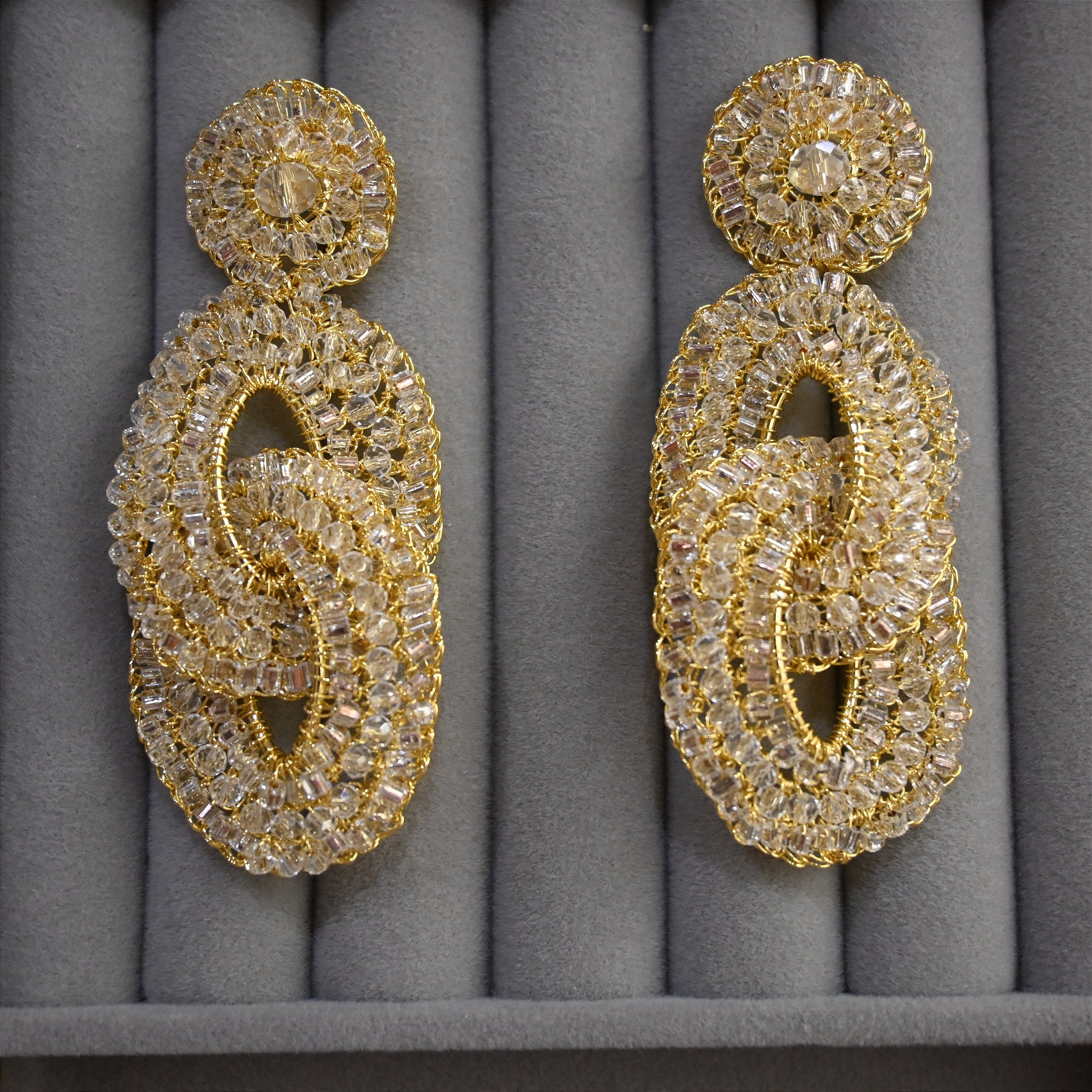 Peças cuidadosamente produzidas em fios de cobre com banho antialérgico em ouro 18k ou paládio. A peça tem seu brilho próprio com cristais, vidrilhos e pedras naturais.